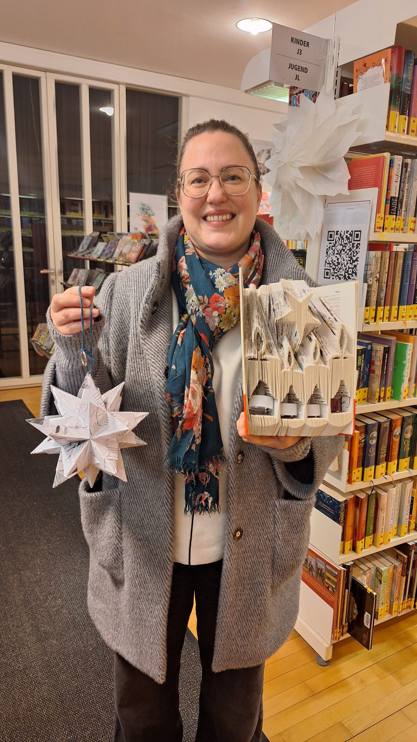 Die gefalteten Buchobjekte konnten von 1. bis 23. Dezember während der Öffnungszeiten der Bibliothek besichtigt und gegen eine Spende erworben werden. Sie eignen sich als individuelle, handgefertigte und nachhaltige Weihnachtsgeschenke mit einer berührenden Geschichte.